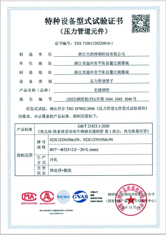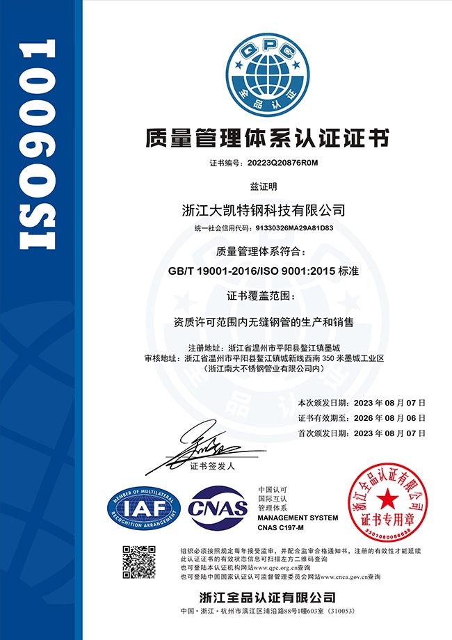 浙江大凱特鋼科技有限公司,原(浙江大凱不銹鋼有限公司)坐落于浙江省溫州市平陽縣鰲江鎮墨城工業區,營銷中心坐落于溫州市龍灣區海濱街道直上路工業園區1號,工廠占地75畝。專業生產不銹鋼,并經營各種材質的圓鋼、無縫管、焊管、緊固件(螺絲)、方管、槽鋼、角鋼、板材、法蘭、彎頭、封頭、閥門、藥機(罐)、塊狀卡壓式水管等業務。現擁有4臺穿孔機組、16臺冷軋機組、12臺冷拔機組等先進生產設備。